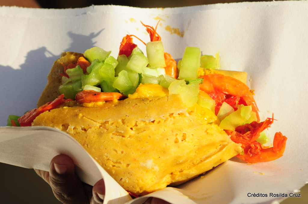 Preparado com um bolinho de feijão fradinho artesanal, temperado com cebola e sal, frito em azeite de dendê e depois recheado com vatapá ( leite de coco, castanha de caju, amendoim e camarão ), vinagrete e camarão seco.