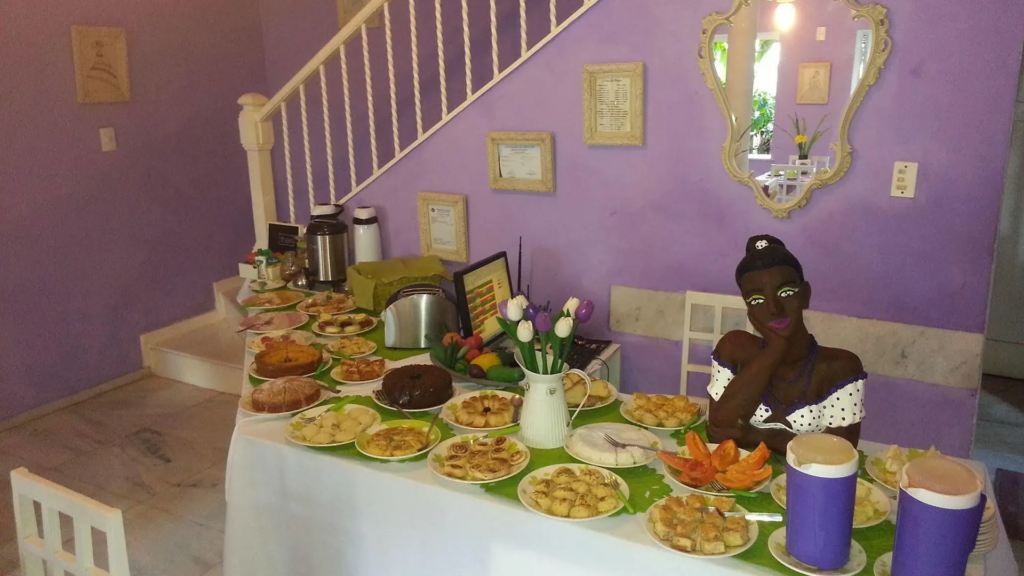 Oferece um café da manhã variado, com frutas tropicais da época, sucos diversos, alimentos leves e típicos de Salvador, Bahia.