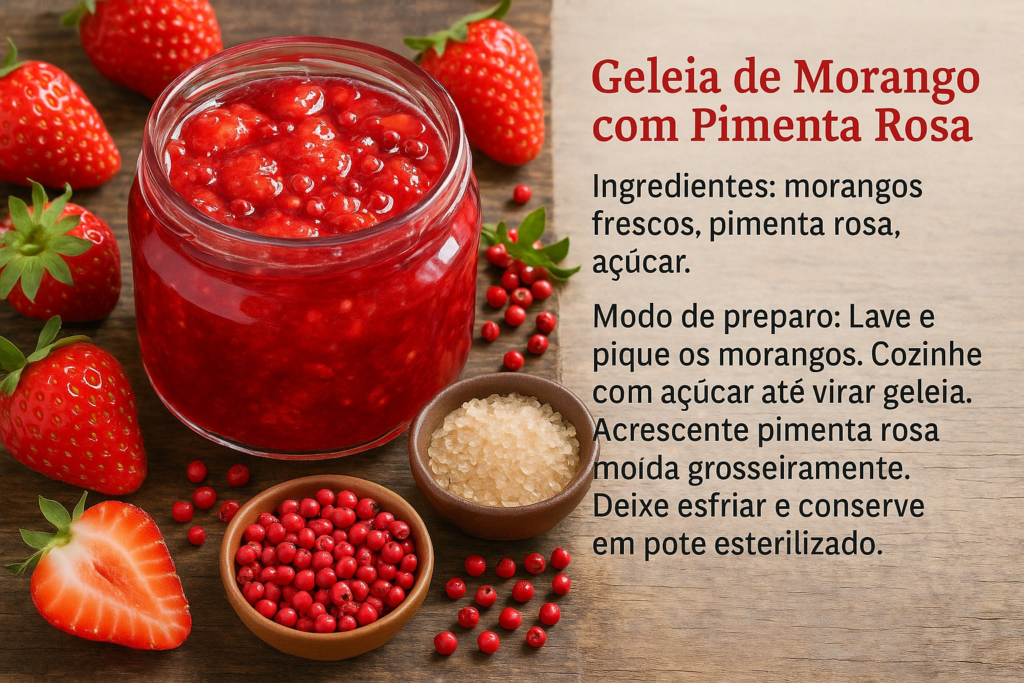 Os ingredientes são 340g de morangos picados, 130g de açúcar refinado, 5 ml de suco de limão e pimenta rosa.Misture tudo e ferva por 20 minutos mexendo o tacho.E pronto.